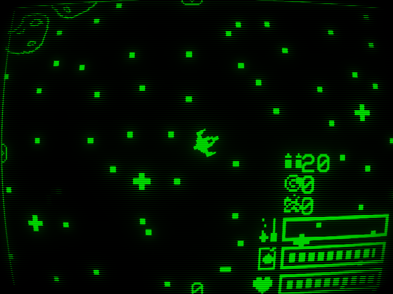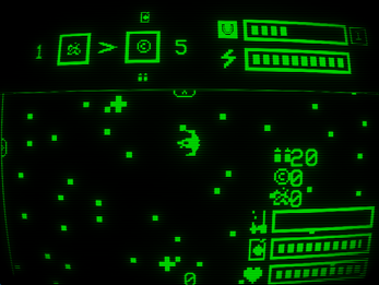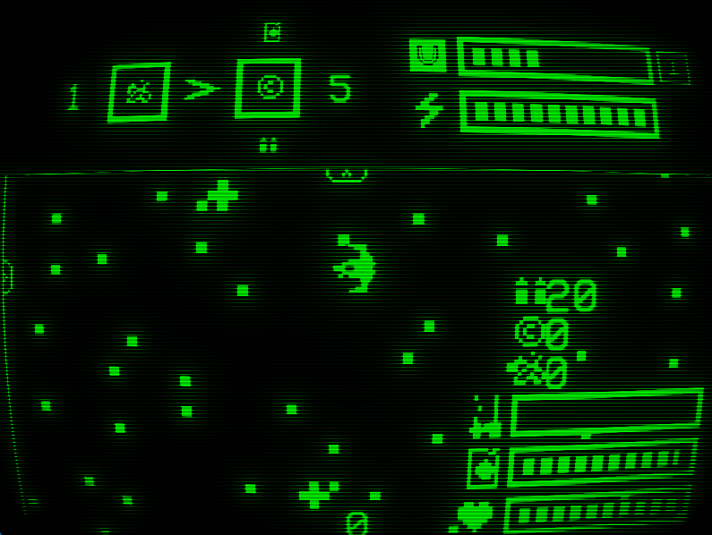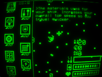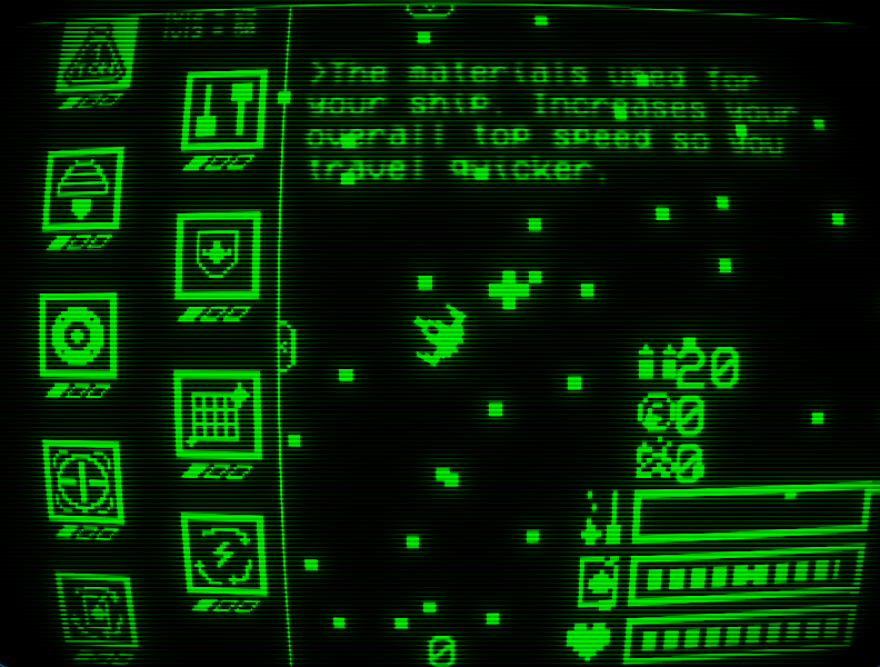 You have a set of stats you need to pay attention to, each of which depleting can cause a LOT of trouble- running out of fuel will make you unable to move forward; running out of bullets will make you unable to shoot; running out of electricity will make you unable to rotate; running out of health will make you (obviously) explode. All of these will add additional challenge forcing you to manage your money.